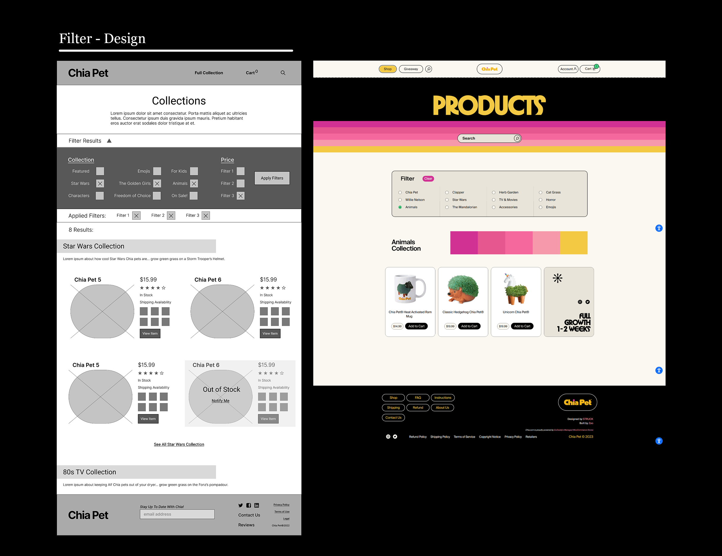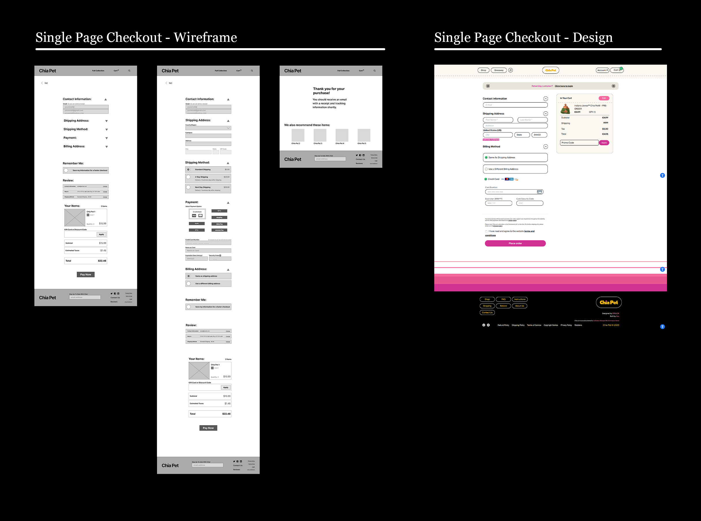 When designing the Product and Checkout pages for this website I had to think differently. Chia Pets are a charming impulse buy, not a necessity or a large financial commitment. A small amount of friction could cause a customer to abandon the site before completing their purchase. The Product categories, Product pages, and Checkout flow needed to be super easy.